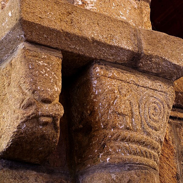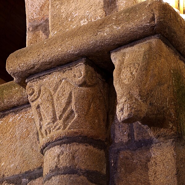 Eglise en granit pouvant remonter au XIe siècle, dont le choeur a été reconstruit au XVe siècle. La nef romane a été modifiée au XIIe et XIIIe siècle. De l'édifice primitif subsistent cinq travées de la nef et la majeure partie du mur de l'abside. Les piliers sont ornés de chapiteaux sculptés. Divers ornements sont placés à la rencontre des bandeaux et des nervures verticales qui séparent les travées.